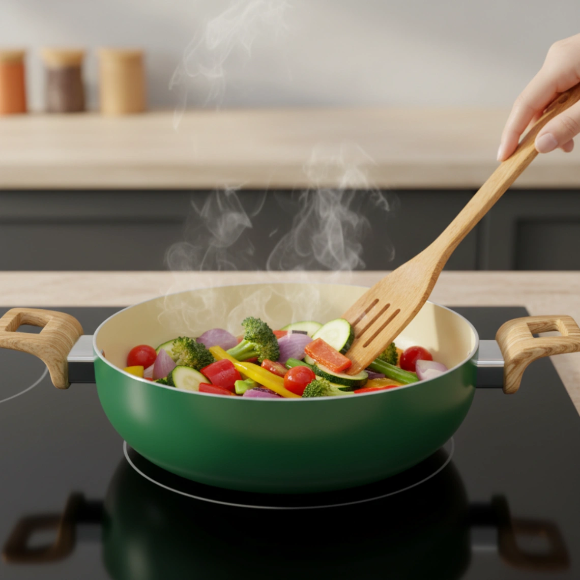 - Strong Build & Handles → Ergonomically designed wooden-style handles stay cool while giving a secure grip. Helps you avoid accidental slips while lifting.